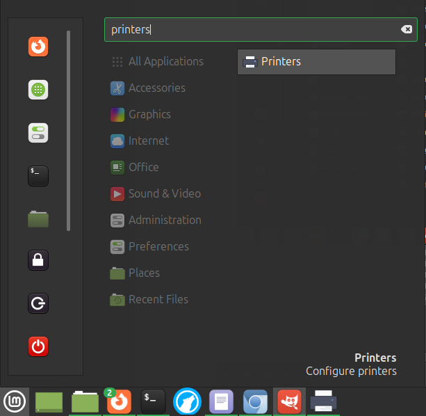15. Go to the top left corner button (Activities Overview) or the menu in the lower left corner and click it, then search for printers and when the Printers icon appears open printers
