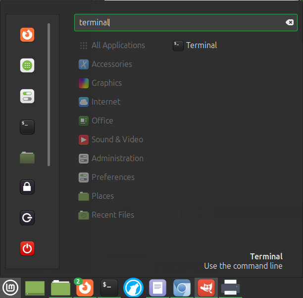 From to the top left corner button (Activities Overview) or the menu in the lower left corner and click it, then search for terminal and when the Terminal icon appears open the Terminal application like so: