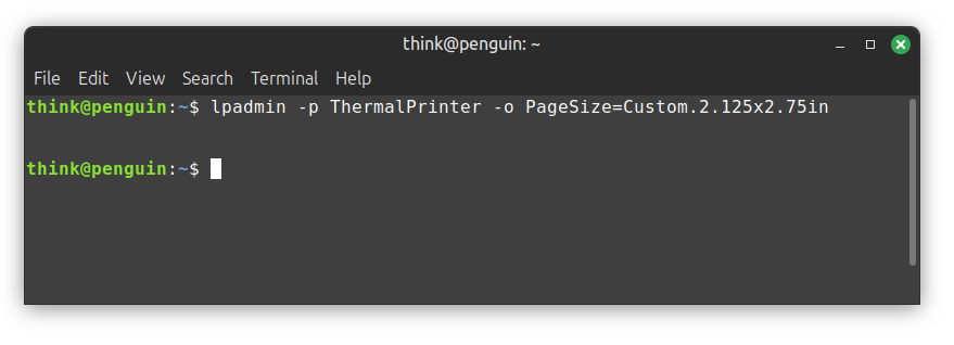 34. Run the following command by typing it into the terminal and hitting the enter key afterward, but replace ThermalPrinter with whatever you named the printer, and replace 2.125x2.75 with the size of your labels: