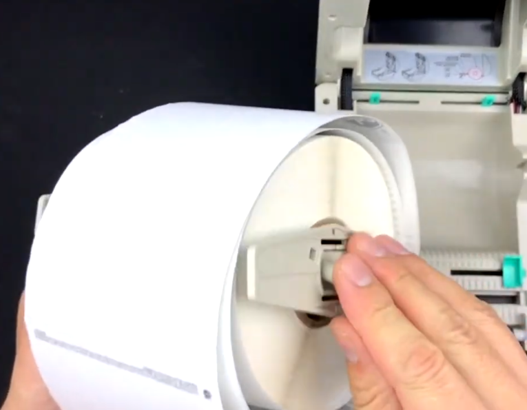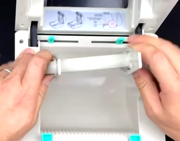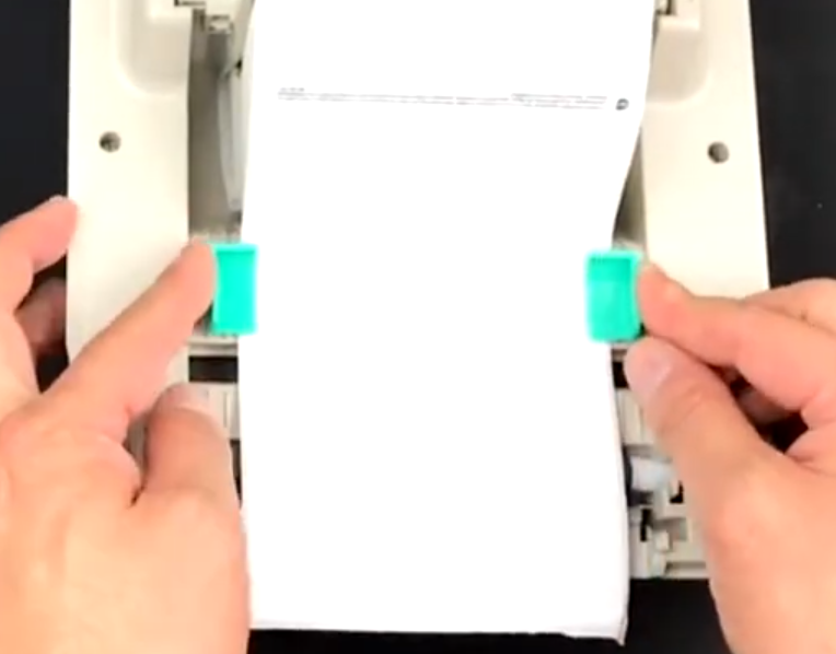 8. Place the rod and shipping roll back into the shipping label printer, be sure the orientation of the roll is correct, you want the first sheet of the roll to be appearing from the top, facing the mouth of the printer, and position the shipping label roll in the center of the rod, take the first sheet out of the roll and position it under and between the two green sliders as shown below, then bring the sliders closer to each other to secure the sheet